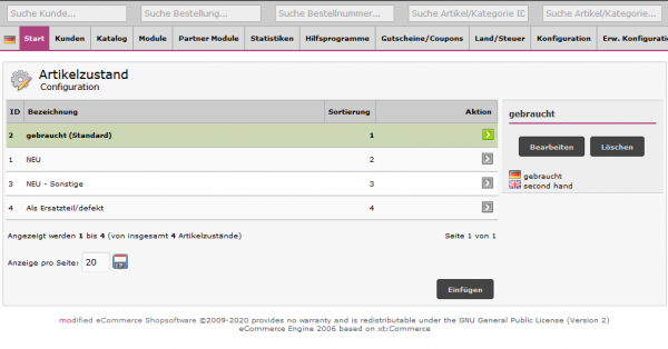 Um den Artikelzustand im Shop verwenden zu können, installieren Sie dieses Modul. Danach steht Ihnen diese Option direkt in der Bearbeitung Ihres Artikels zur Verfügung. Benötigen Sie verschiedene Artikelzustände (Conditionen), legen Sie diese ganz einfach im "Admin > Katalog > Artikel-Conditionen" an, und schon sind diese für alle Produkte zuweisbar. Gleichfalls können Sie bei Installation des Moduls einen Content wählen, der zur Erklärung der Artikelzustände als Informationen in der Lightbox anzeigt werden kann.