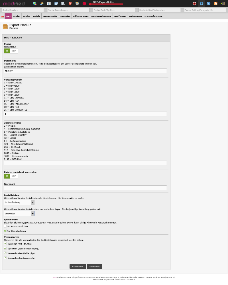Per Knopfduck erstellen Sie die Export-Datei, um Bestelldaten zu DPD zu übertragen und Versandaufträge zu erstellen.
