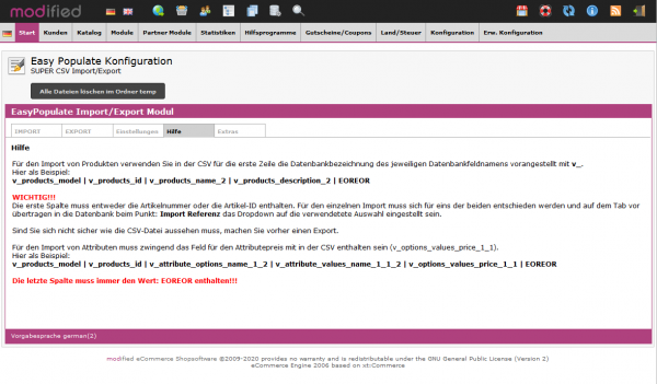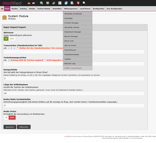 Sie installieren dieses Modul im Admin über die System-Module und tragen dort die Werte für Ihre Import- und Export-Dateien in die Konfigurationsmaske ein. Zum besseren Verständnis, erhalten Sie mit diesem Modul drei Masterdateien, die Ihnen gleichzeitig den Aufbau der Import / Export-Dateien abbilden.