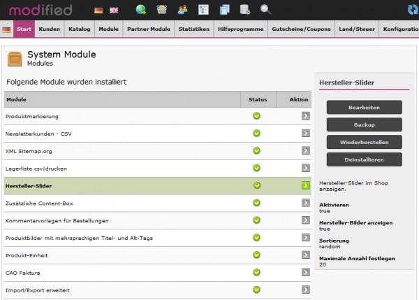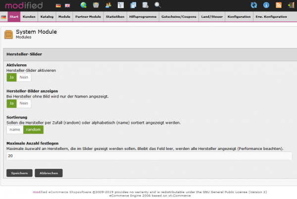 In der Konfiguration des Moduls können Sie festlegen, ob die hinterlegten Herstellerlogos oder nur die Herstellernamen im Slider angezeigt werden sollen. Außerdem legen Sie hier fest, ob die Hersteller per Zufall oder alphabetisch sortiert nach Namen dargestellt werden.