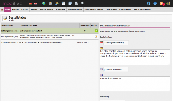 Nach der Installation des Moduls wird ein neuer Menüpunk im Admin-Bereich > Kunden > Bestellstatus Texte angezeigt. Hier können Sie Textvorlagen mehrsprachig erstellen und editieren. Diese erstellten Textvorlagen stehen nun in jeder Kundenbestellung beim Kommentarfeld per Dropdown zur Verfügung. Sie wählen aus dem Dropdown die richtige Textvorlage aus und der Text wird automatisch ins Kommentarfeld geladen. Der eingeladene Text kann auch jeweils nochmals in der Bestellung individuell geändert werden.
