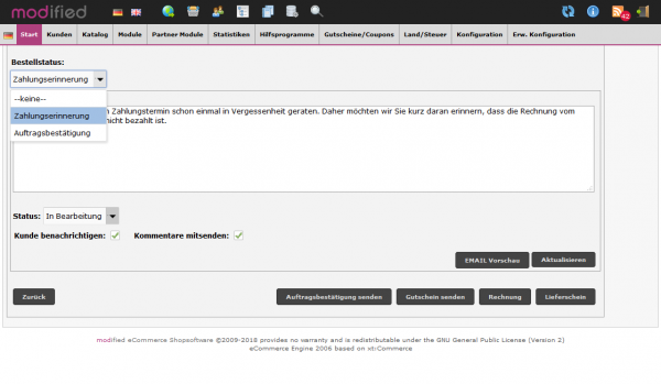 In der Bearbeitung der Bestellung wählen Sie einfach die passende Textvorlage per Dropdown aus.