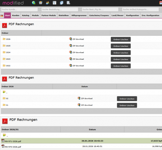 Ordner zur Archivierung der PDF-Rechnungen, PDF-Lieferscheine und PDF-Angebote werden automatisch nach Jahres- und Monats-Ordner nach Rechnungsdatum bzw. für Angebote nach Erstellungsjahr erstellt. Im Archiv können Sie alle oder einzelne Ordner als ZIP-Dateien herunterladen, um bei Bedarf die Dokumente auf eigene Datenträger zu archivieren.