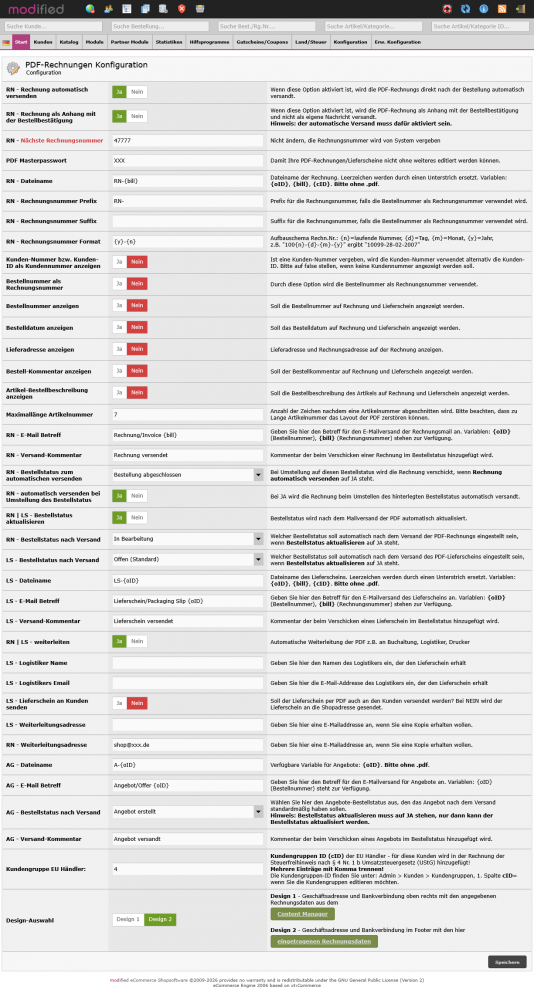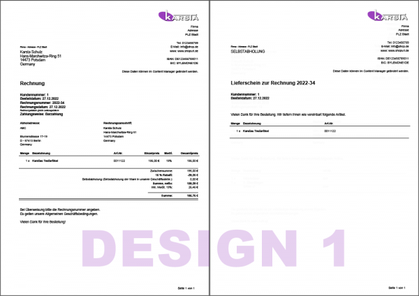- Auswahl - Rechnungsdesign "Design 1" oder "Design 2"