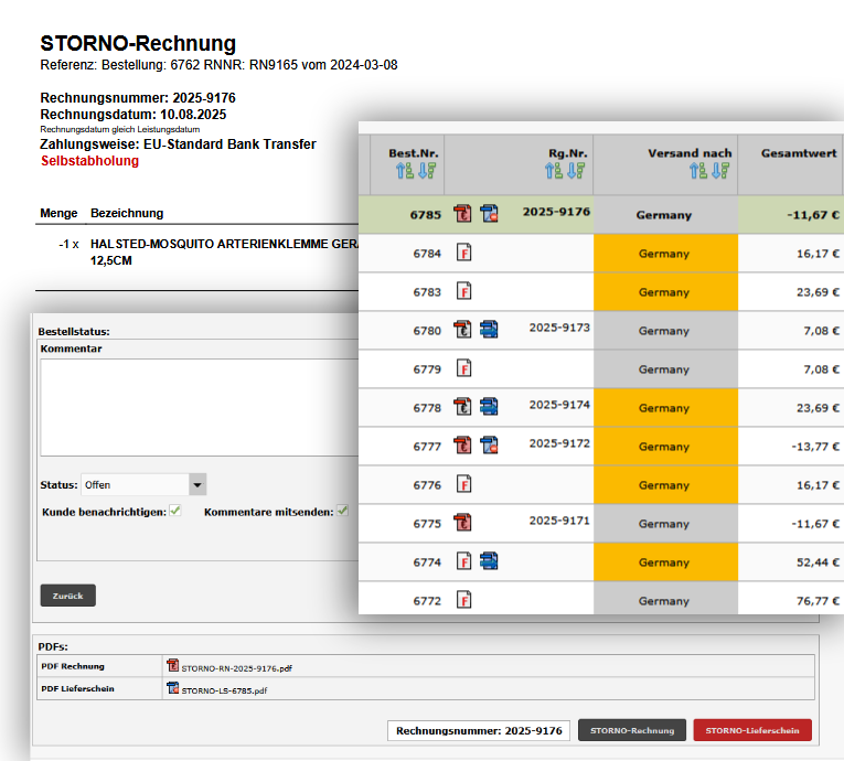 Es wird eine neue Bestellung mit allen Positionen und Kosten, einer neuen Bestellnummer, dem aktuellen Datum und der vollständigen Information zur Referenzbestellung erstellt. Um den Beleg zu versenden und ordnungsgemäß mit in die Buchhaltung zu nehmen, erstellen Sie eine neue Rechnungsnummer, inkl. Rechnungsdatum. (Bei Verwendung des E-Rechnungsmoduls, wird die Storno-Rechnung ebenfalls als ZUGFeRD-Rechnung erstellt.)