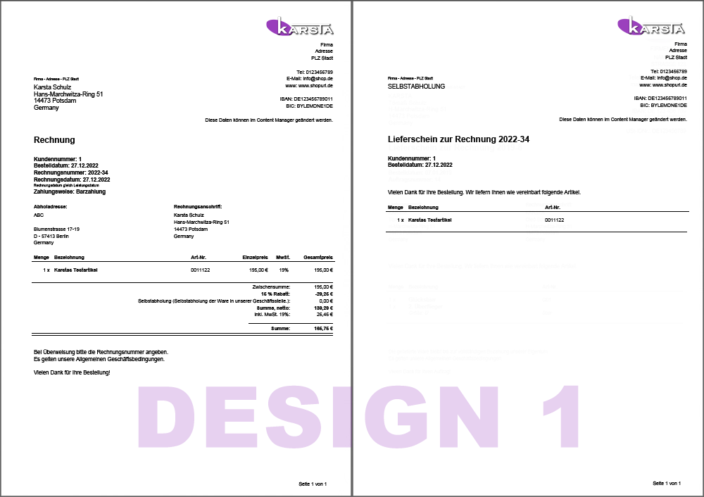 Zur Verwendung stehen zwei Design zu Verfügung. Im Design 1 werden alle Geschäftsangaben aus dem Content-Manager "Rechnungsdaten" oben rechts auf der ersten Seite angezeigt. Design 2 zeigt alle Geschäftsangaben unten auf jeder Seite als 3 oder 4 Blöcke an.