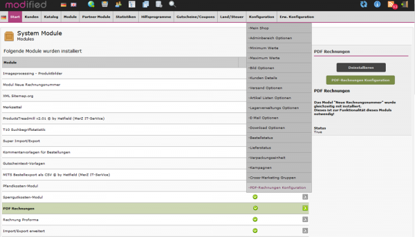 Dieses Modul ist updatesicher und PHP8 fähig. Euro- und Sonderzeichen werden auf der PDF-Rechnung korrekt angezeigt. Funktioniert mit der neuesten modified eCommerce Shopsoftware Version. Das X-Rechnungsformat wird bisher nicht unterstützt.