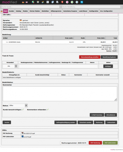 - automatischer Wechsel des Bestellstatus nach erfolgreichem Versand der Rechnung oder des Lieferscheins
