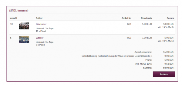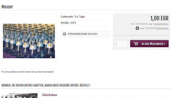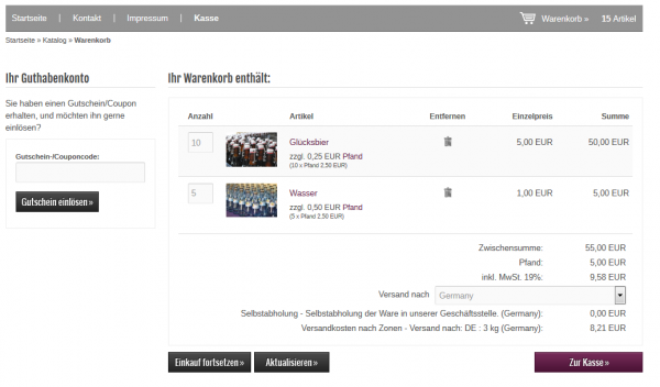 Die Pfandkosten sieht Ihr Kunde direkt beim Artikel, in der Produktliste, im Warenkorb, im Checkout und auf der Rechnung. Pfandkosten werden pro Artikel berechnet und mit ändern der bestellten Artikelmengen wird der Pfandbetrag hochgerechnet.