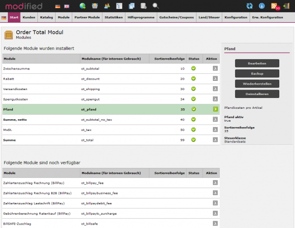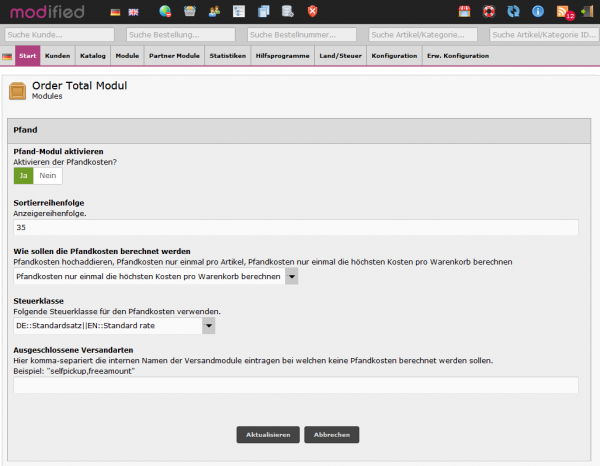 Um die Berechnung der Pfandkosten im Warenkorb und in der Bestellung zu verwenden, aktivieren Sie im Admin-Bereich unter Module > Zusammenfassung die Pfandkosten, legen Sie den korrekten Steuersatz fest und wählen Sie aus, wie die Pfandkosten berechnet werden sollen.