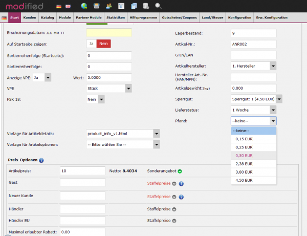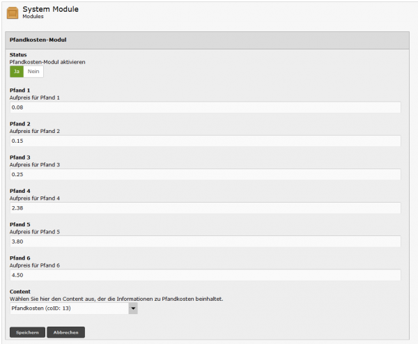 Das Pfandmodul wird unter Module > System-Module im Backend installiert. Tragen Sie die Pfandkosten ein, die Sie benötigen und wählen Sie den Content aus, der die Informationen zu den Pfandkosten beinhaltet. Dann stehen Ihnen die Funktionen des Moduls beim Anlegen eines Artikels zur Verfügung. Standardmäßig haben wir Ihnen das Modul so eingestellt, dass Sie 6 verschiedene Pfandkostenbeträge hinterlegen können.