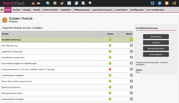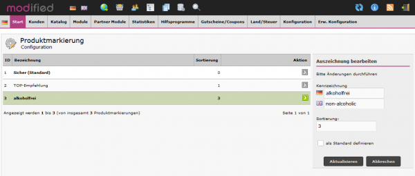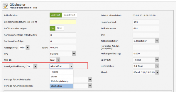Unter dem Artikel-Katalog haben Sie mit diesem Modul einen neuen Menüpunkt "Produktmarkierung", unter dem Sie die Bezeichnungen, die Sie für Ihre Produkte brauchen erstellen können. Danach stehen Ihnen diese beim Anlegen oder Editieren eines Artikels zur Verfügung. Sie haben ein Dropdown zur Zuordnung Ihrer angelegten Markierungen und dann weiter ein Dropdown mit der Auswahl ob die Markierung bei diesem Artikel angezeigt werden soll oder nicht.