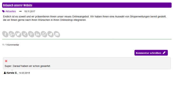 Mit dem integrierten Blog-Modul haben Sie die Möglichkeit Ihre Kunden über aktuelle Themen zu informieren und die neuesten Beiträge auf Ihrer Startseite anzeigen zu lassen. Mittels der integrierten Shariff-Socialmedia-Button können Ihre Kunden Ihre Blogbeiträge auf Social-Media teilen. Gleichfalls finden Sie alle aktivierten Blogbeiträge auch als Links in Ihrer Sitemap.