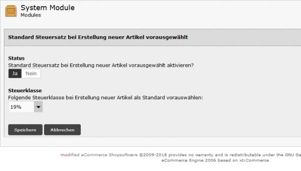 Mit Installation dieser Erweiterung wird beim Anlegen von neuen Artikeln der Standardsteuersatz voreingestellt gesetzt und eingetragen. Vergessen der Eintragung eines Steuersatzes wird damit ausgeschlossen.