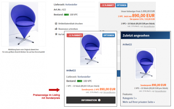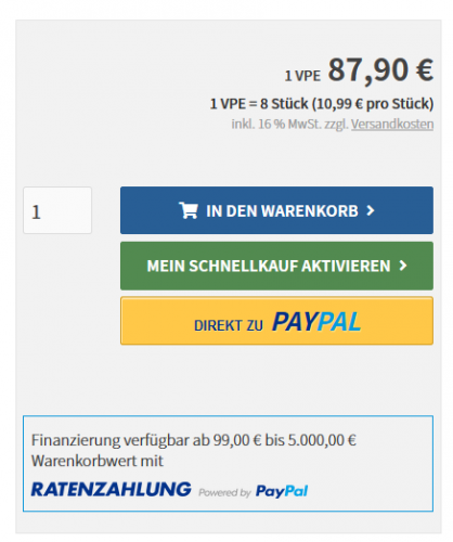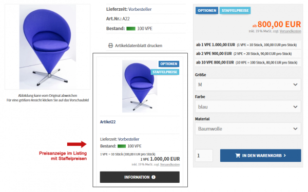 Als Beispiel: Sie legen einmal die VPE fest: 1 Karton und dann die Menge, also die Produkanzahl der Bogen Papier, die der Kunde mit diesem Artikel erhält. Wenn alle Werte korrekt eingestellt sind, wird der Preis des einzelnen Bogen Papiers dem Kunden rechtskonform im Onlineshop angezeigt. Das funktioniert gleichfalls auch für die Anzeige der Staffel- und Sonderpreise.