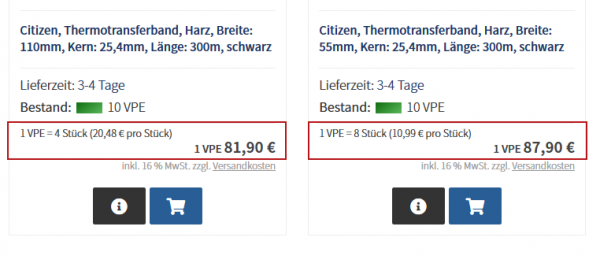 Anzeige der Verpackungseinheit mit genauer Bezeichnung, Menge und Einzelpreis des Artikels.